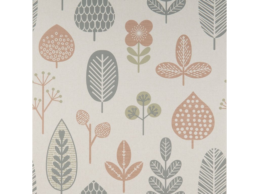 Vliesová tapeta, struktura jemné textilie. Podklad bílo-šedý, vzor odstíny šedé, růžové a khaki.